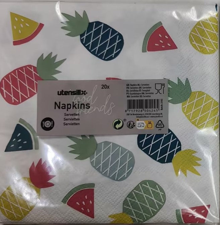 Vrolijk je feestje op met deze frisse fruitige servetten! Met kleurrijke prints van ananas, watermeloen en meer zomers lekkers zijn deze servetten perfect voor tuinfeestjes, picknicks of tropische thema-avonden. Niet alleen praktisch, maar ook een feestje op tafel.